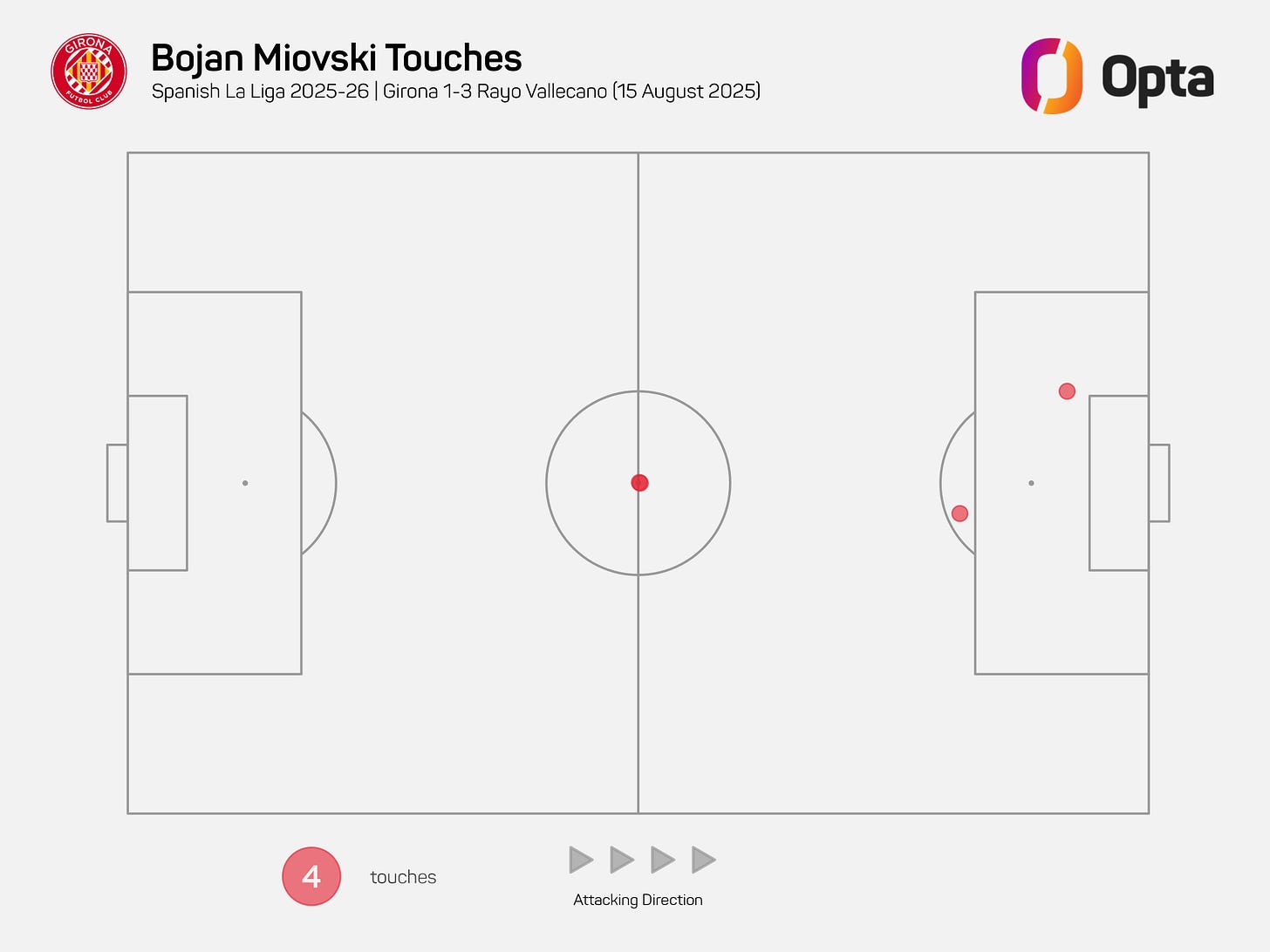 Since Miovski joined last summer, he has played 921 minutes and averaged 19.8 touches per 90; the lowest among all Girona players to have played at least 500 minutes in that time. He has also averaged just 0.4 shots on target per 90, compared to Cristhian Stuani’s 1.61 per 90.