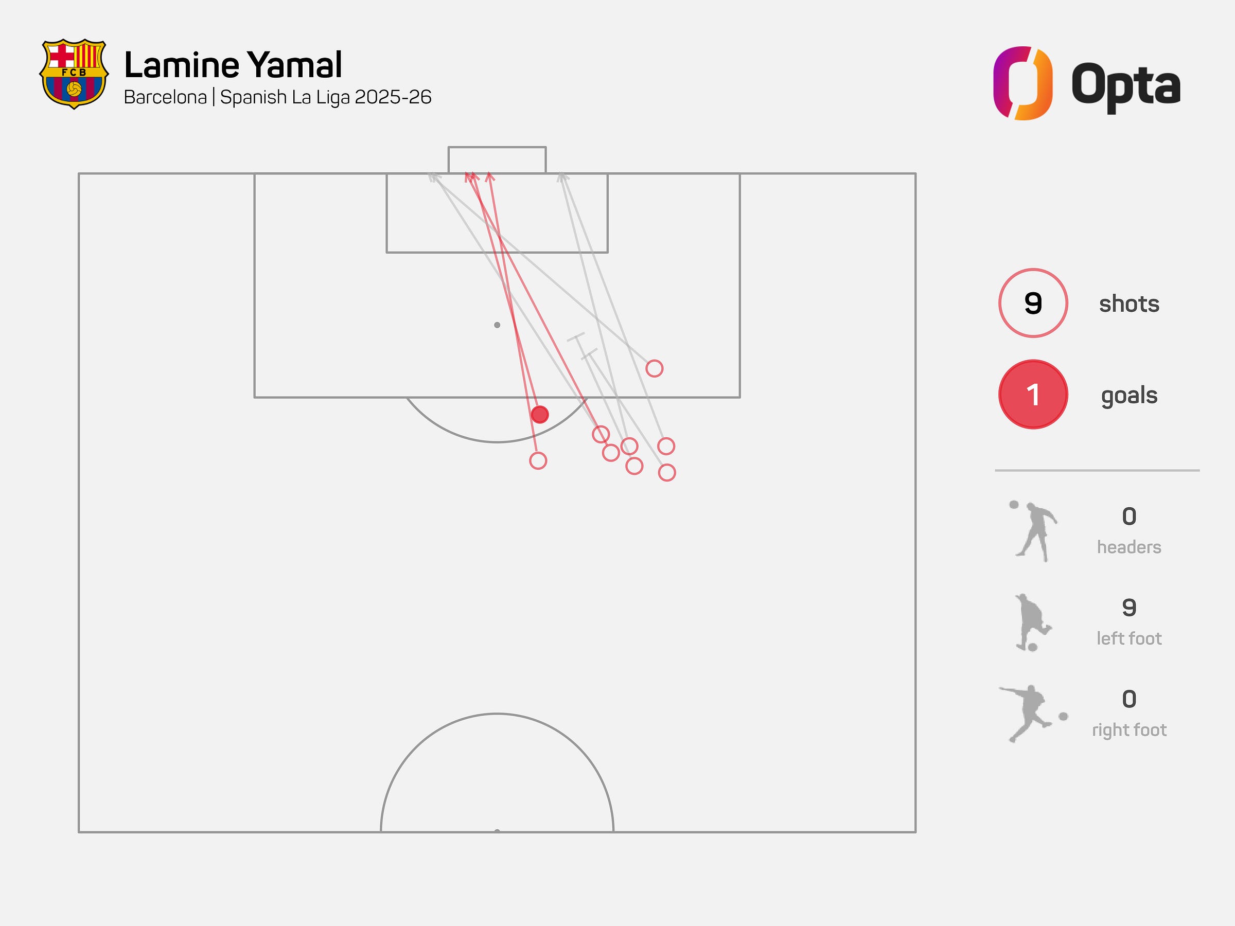 Yamal still, largely, got where he wanted to go. With sporadic runs taking Mojica to the touchline just to keep him guessing — including with his first touch of the season just over two minutes in — the Barça’s man’s eventual shot map turned out to be an instructive one.