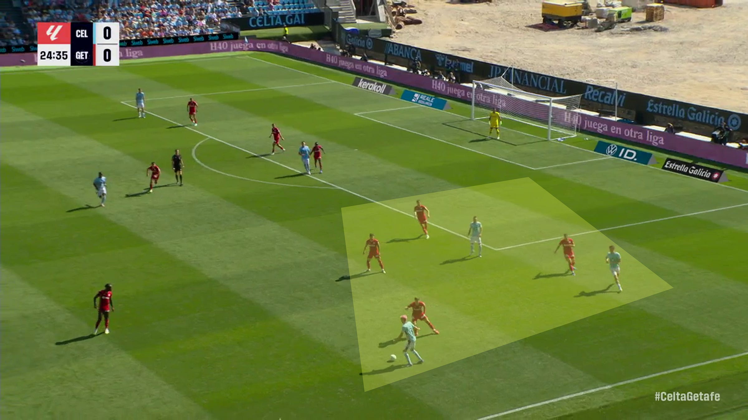 Giráldez’s side rarely found their rhythm and struggled to displace Getafe’s centre backs, which thus meant opting into wide attacks more than they’d like. But without their usual speed of passing, the problem they then found was Getafe collapsing onto the side and presenting them with another big obstacle.
