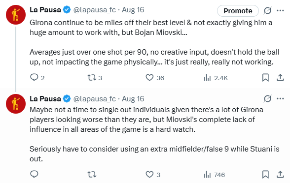 It is hard to think of a worse 45 minutes than Bojan Miovski’s start to the season on Friday night, as Rayo Vallecano downed Girona 3-1 at Montilivi. Okay, we see you Paulo Gazzaniga, but we’re talking outfield players and something as an ongoing concern.