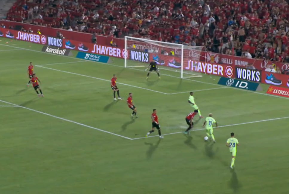 However, even if Mallorca did suffer two red cards, Yamal didn’t want for individual attention in the game. Little came easy. Unless it was a long switch of play to work a momentary one-v-one with Johan Mojica, Mallorca still kept plenty of attention on him. Even down to nine men, Jagoba Arrasate’s tight 4-4-0 kept at least two bodies on the left flank, looking to cover both the dart to the touchline and the cut back inside onto his strong foot.