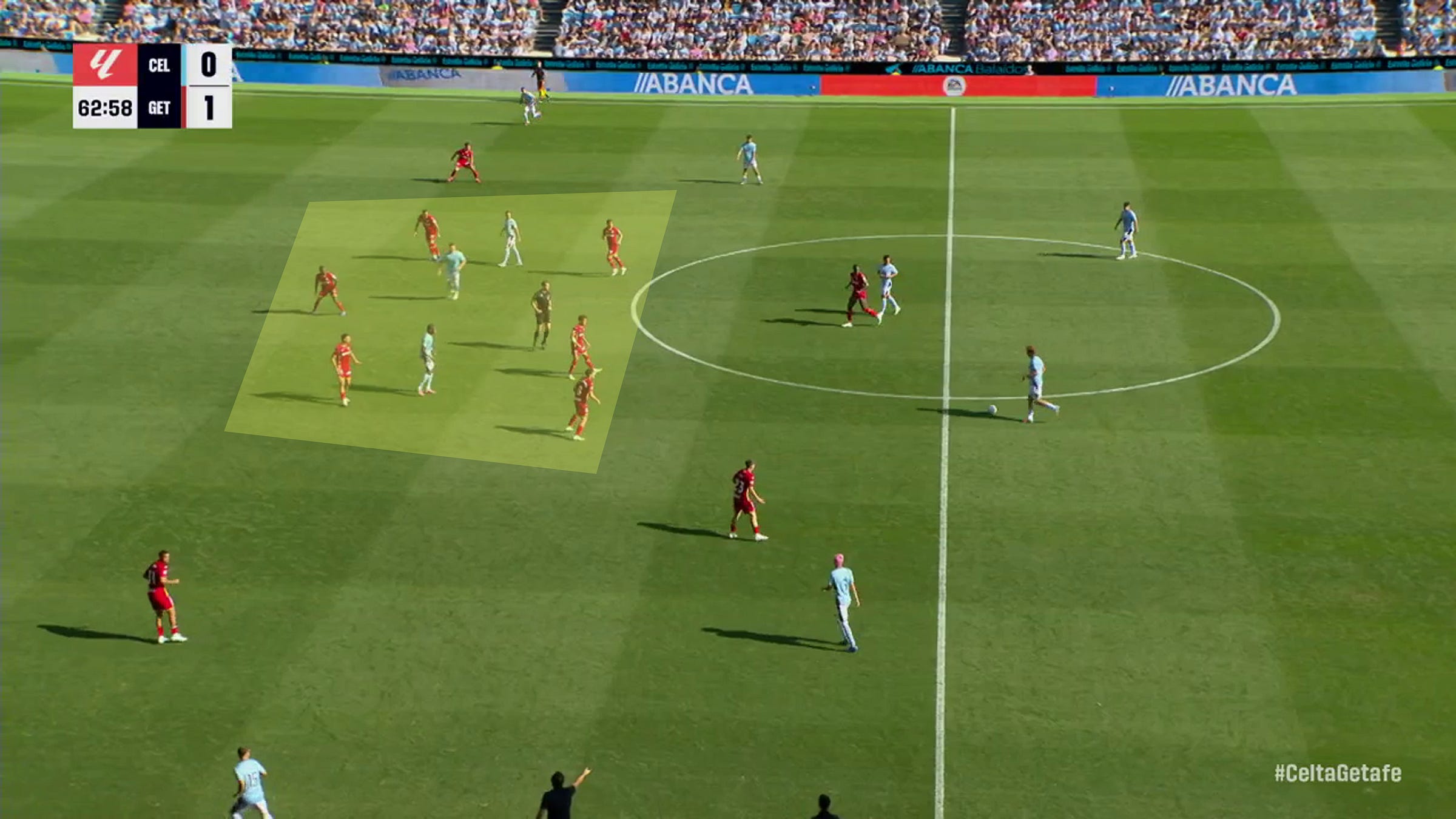 The initial idea was to crowd them out. Crucially, though, there was much to be said about the preparedness of the defenders in anticipating balls over the top or down the sides. As we can see here, the visitors did a fine job of being close enough to get immediate man-to-man pressure on receivers, while being vigilant of Celta looking for runners (and bypassing the Getafe cluster).