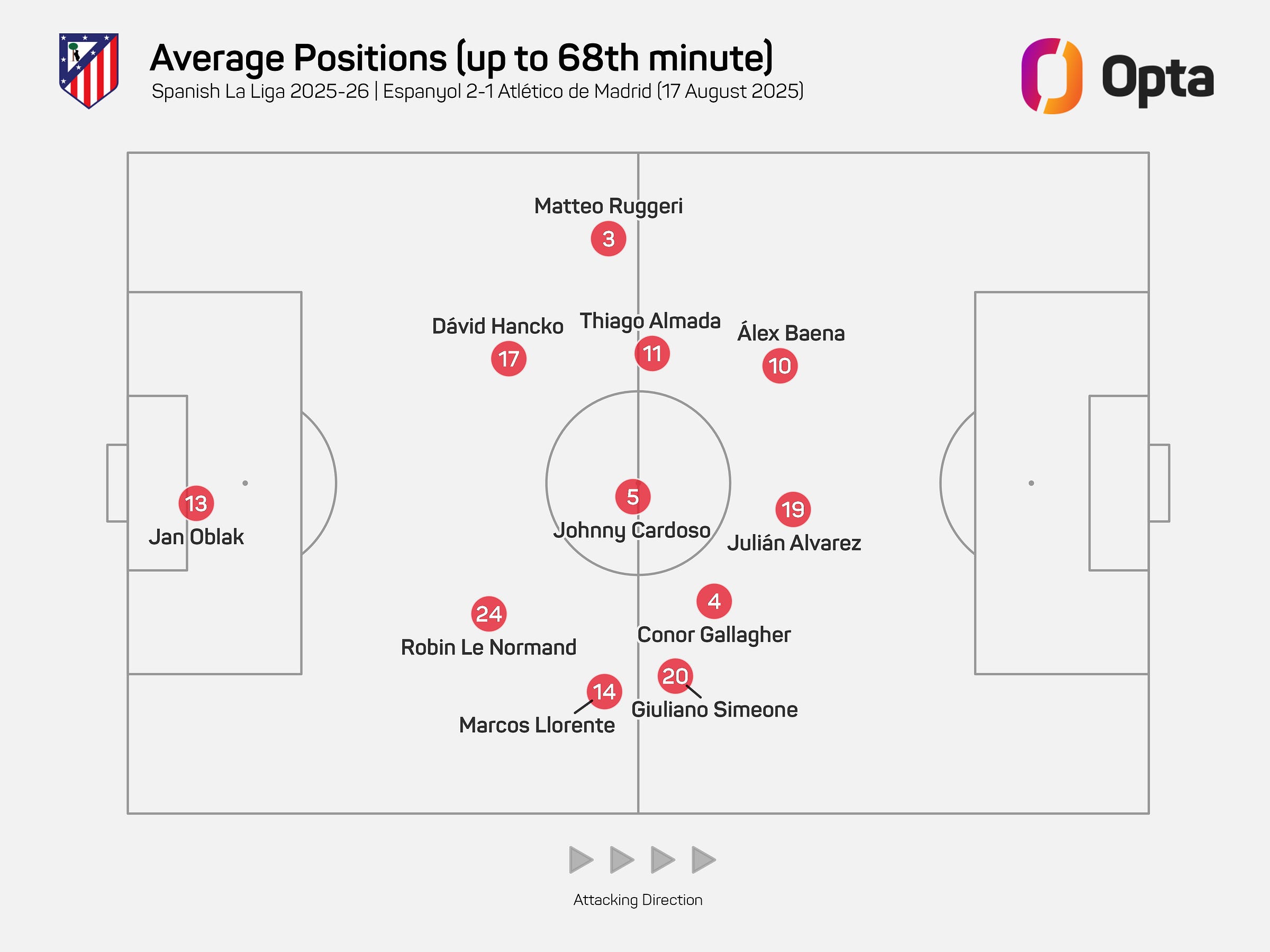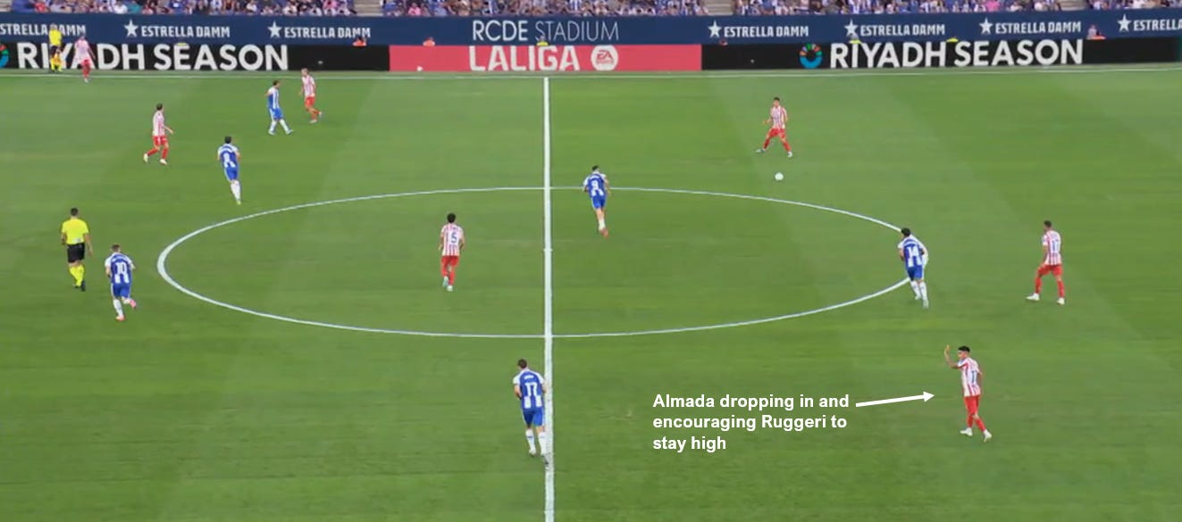 Up until his substitution, only Robin Le Normand (64) had made more passes in the game than Almada (58), and only 11 of those 58 passes were back towards one of Atlético’s two centre backs.