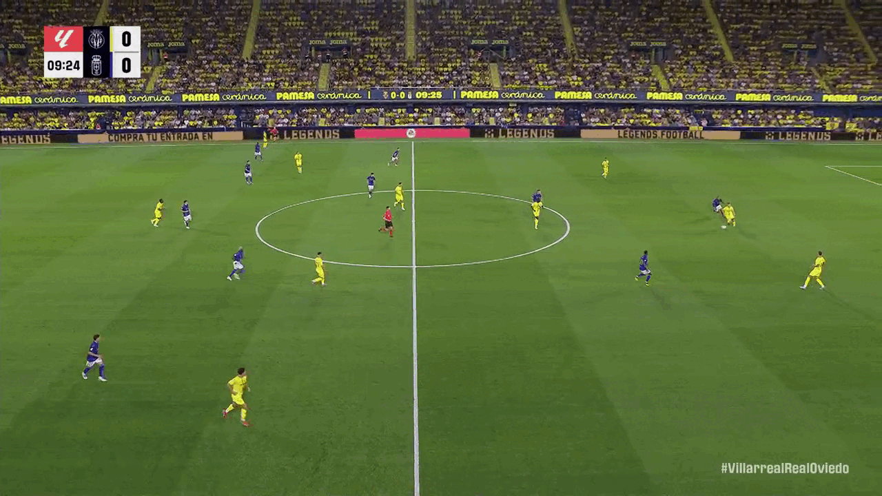 Where Sibo loses sight of Villarreal’s #21, right-sided centre back Oier Luengo hesitates on whether to follow the run of Eyong or shift across and tend to Pino’s dart between the gap. On both occasions, Villarreal were able to bypass midfield and immediately get the opponent’s backline under pressure.