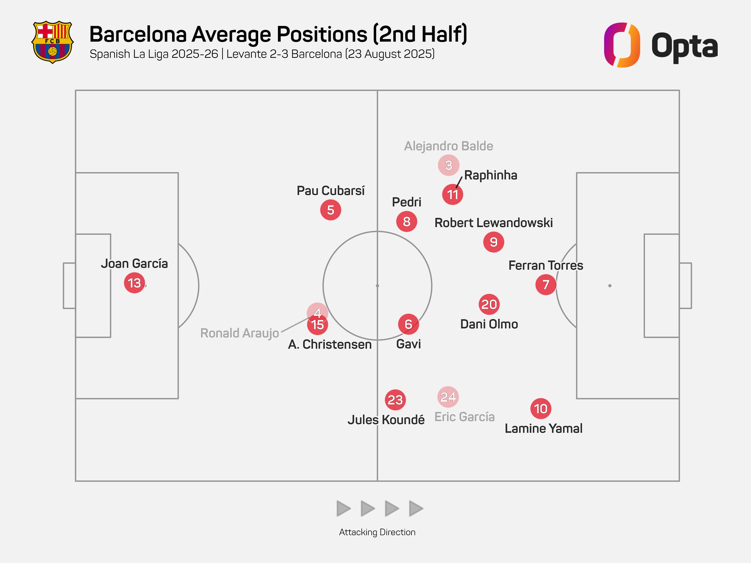 The second half brought adjustments. Raphinha shifted left, drifting into more central pockets and into the left half-space while Balde held width. On the right, Olmo — an instinctive space interpreter — took up the role between the lines.