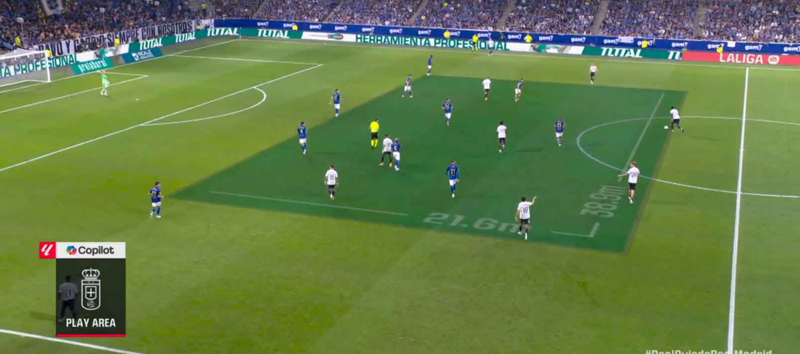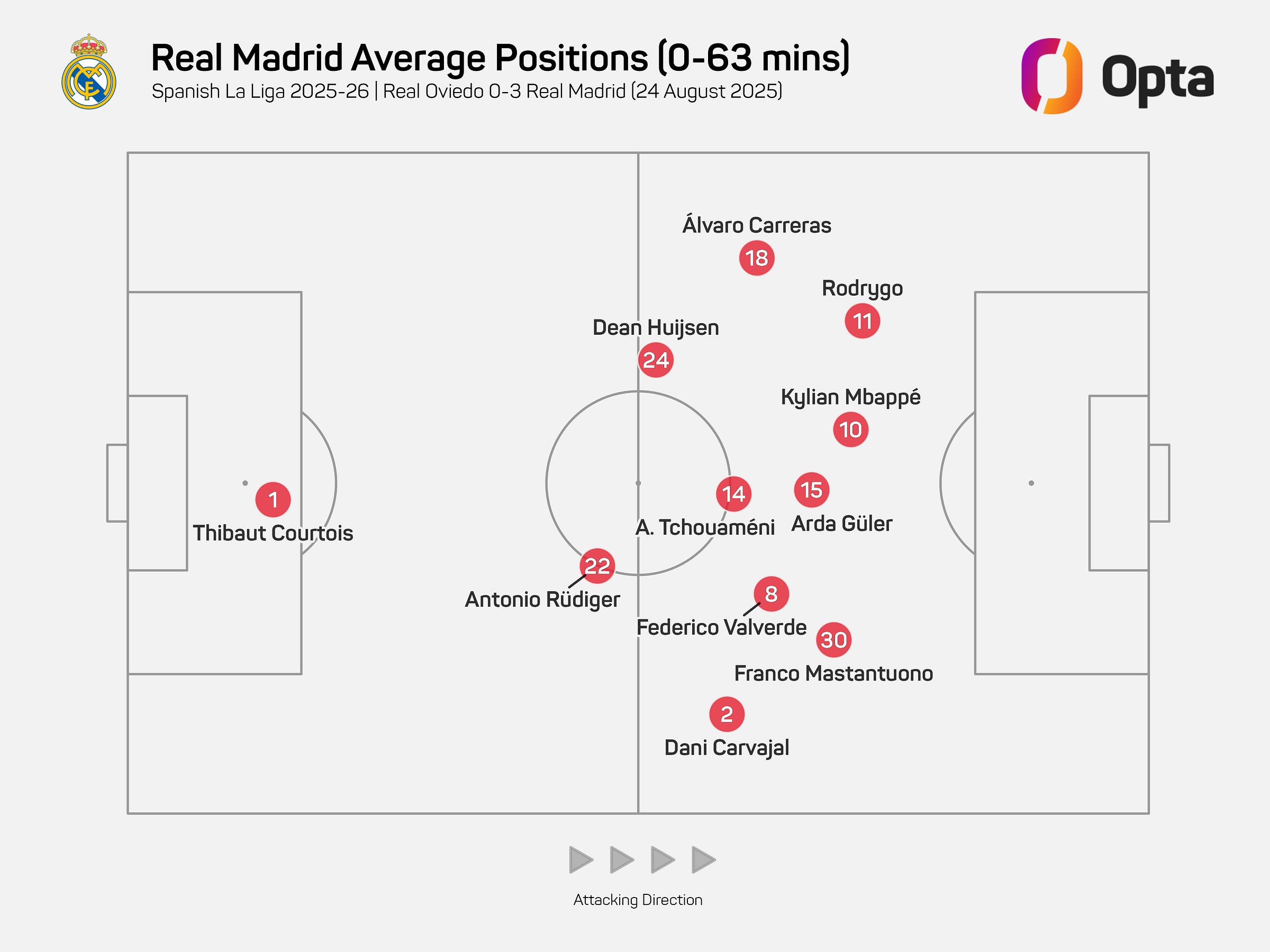 The next step is, of course, how to further sharpen their attacking game without losing that platform. Their four goals so far have been scored from moves containing two or fewer passes (including a penalty), which aren’t exactly tied in to the territorial dominance we’ve previously mentioned. Half of them came late on versus an Oviedo side taking more risks and leaving themselves exposed to quicker attacks.