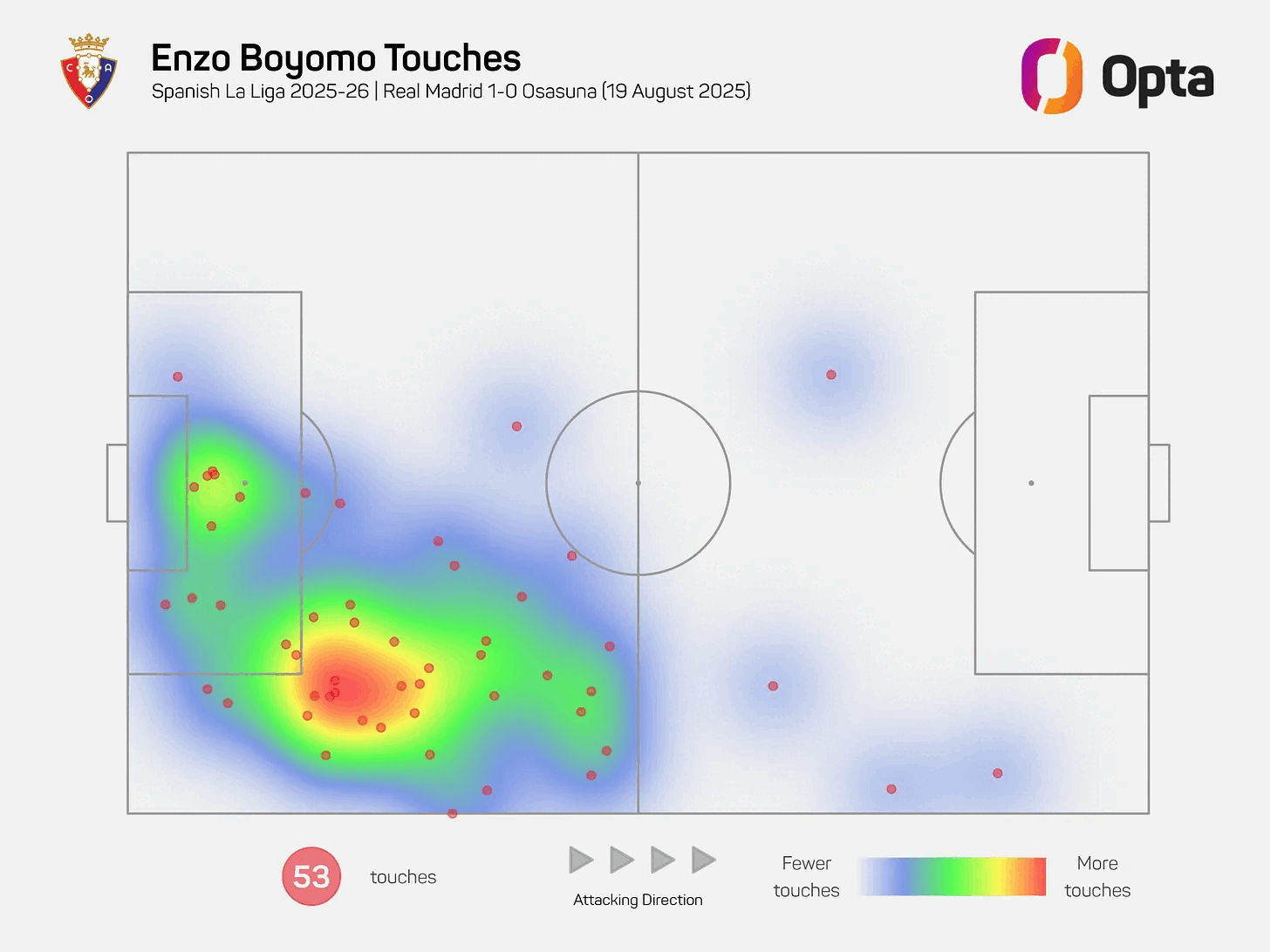 Another new face, Víctor Muñoz, arrived from Real Madrid and has injected real verticality into Osasuna’s attack. He came off the bench against Madrid but earned a start in the following game. What he lacks in finesse, he more than compensates for with sheer pace and directness, giving them much of what they had in spurts from Bryan Zaragoza last term.