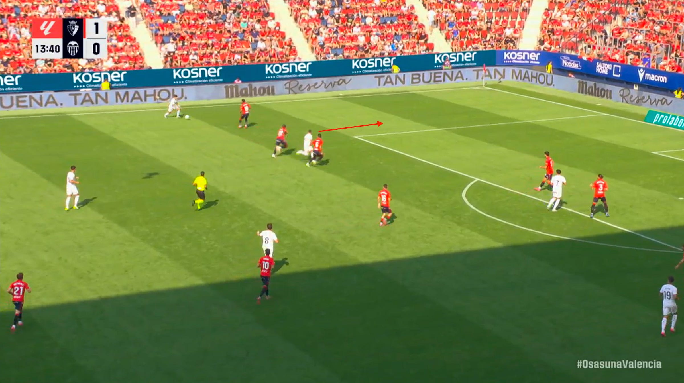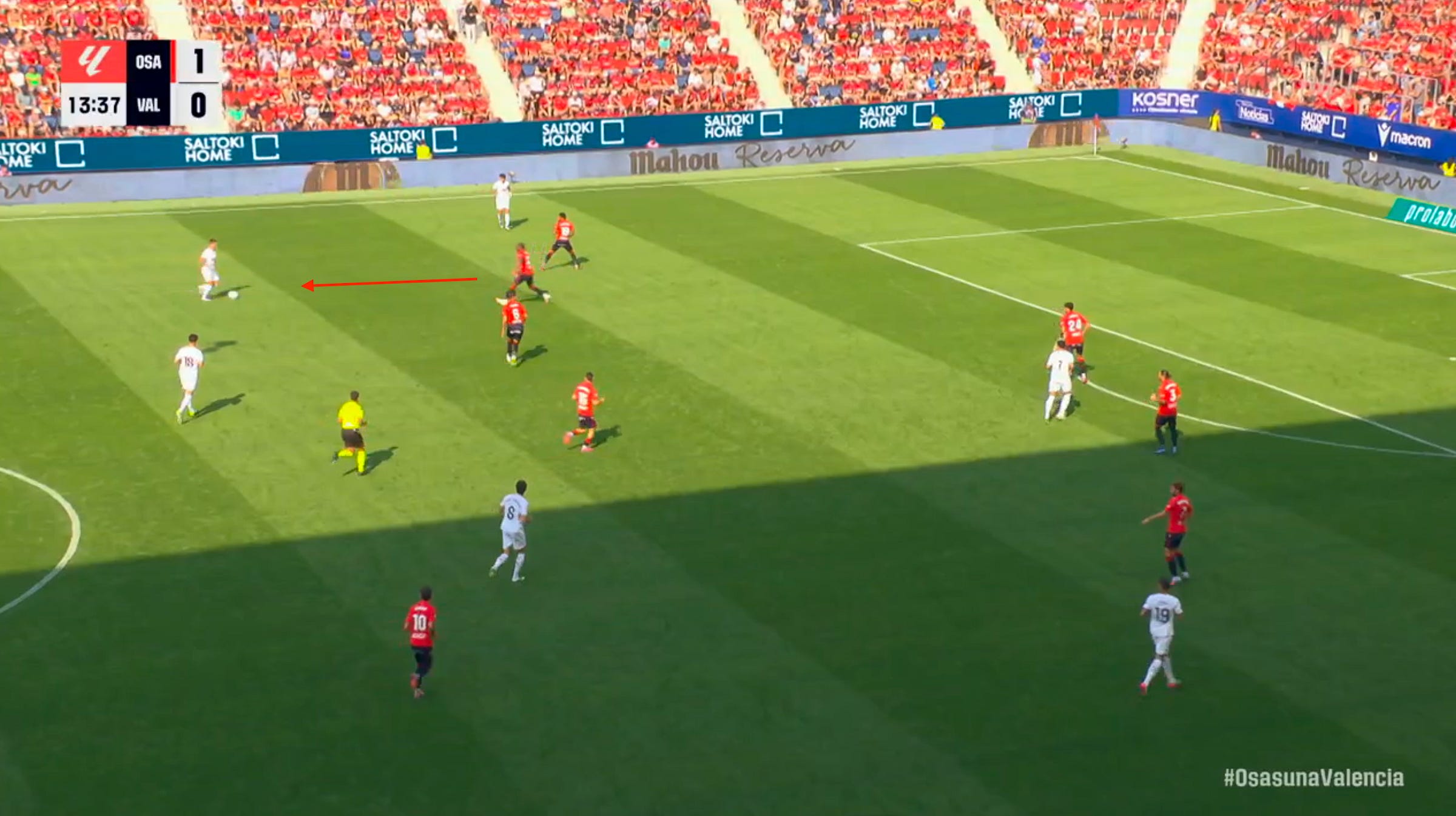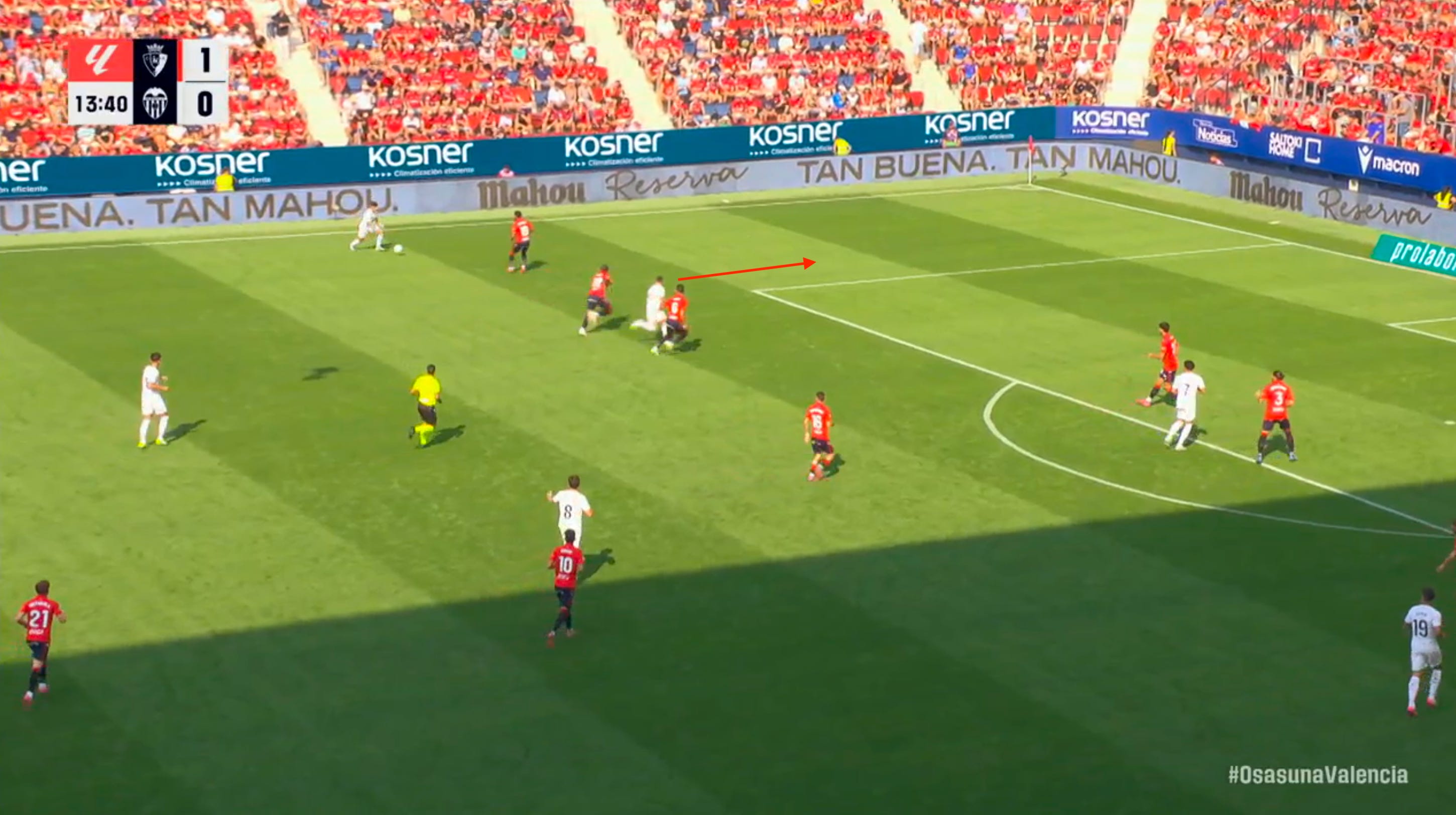 Then, initially feigning interest in getting the ball back, he soon sneaks into a small window over on the right side, making himself available and kickstarting a new attack. After a give-and-go with Kubo on the move, La Real quickly recapture their dynamism, swing the ball across to Marín, and find themselves one pass away from a big chance.