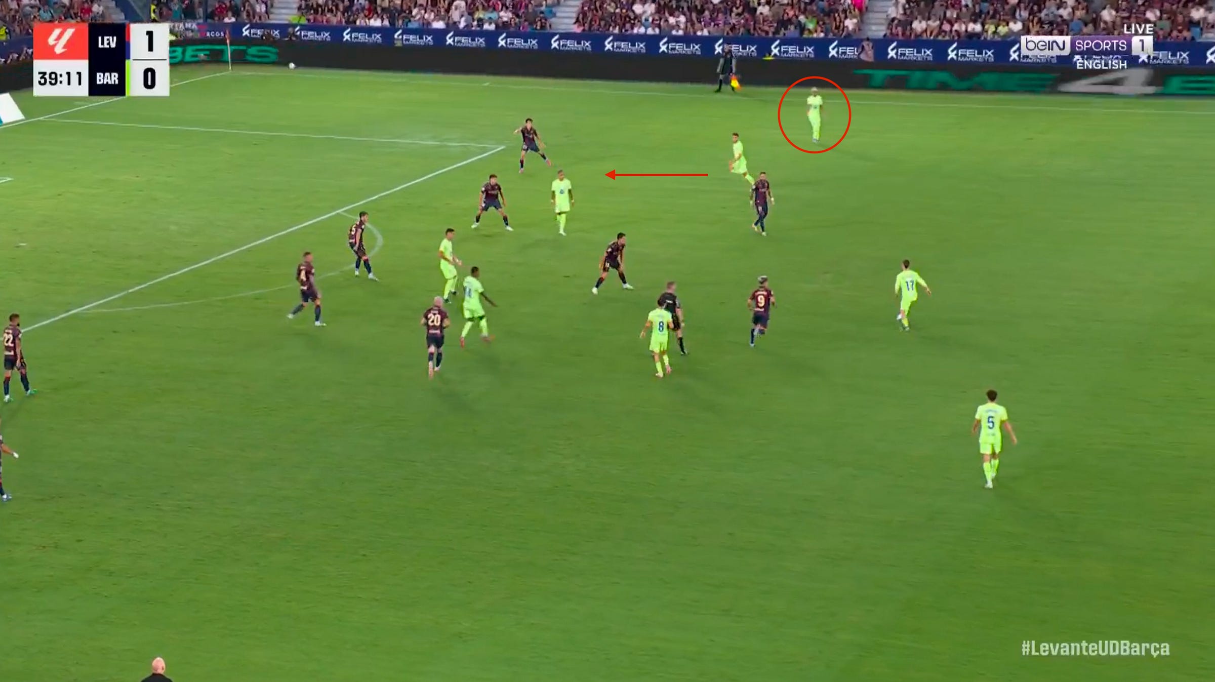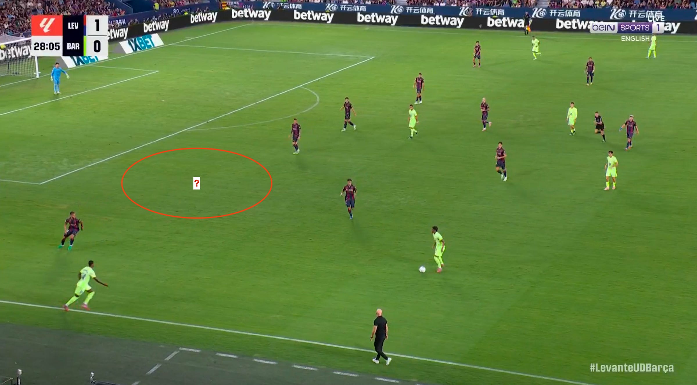 The main issue before the break was Raphinha, tasked with playing Dani Olmo’s role, was too often dropping deep towards the ball instead of stretching Levante’s back five. The only moments when Lamine Yamal could receive in space came when Eric García managed to attack on the inside of Manu Sánchez, creating gaps for Barcelona to exploit.