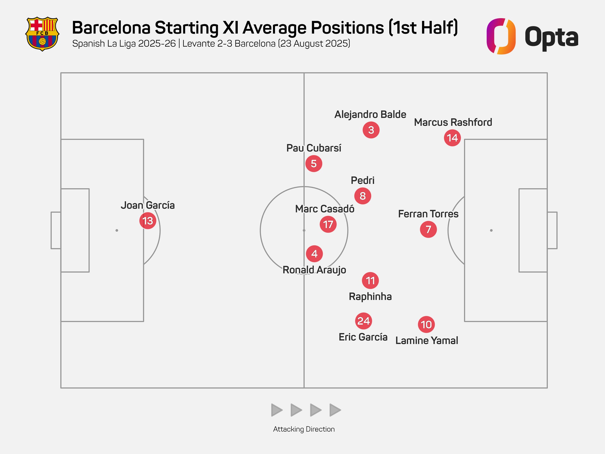 Levante were caught offside six times (and probably another half dozen times where advantage was played), but that was to be expected. It was an inevitable part of counter-attacking where they often only had a couple of seconds to make a decision, with Barça’s backline rapidly squeezing towards them. If you could play offside in the opposition’s half, Flick might push it even further…
