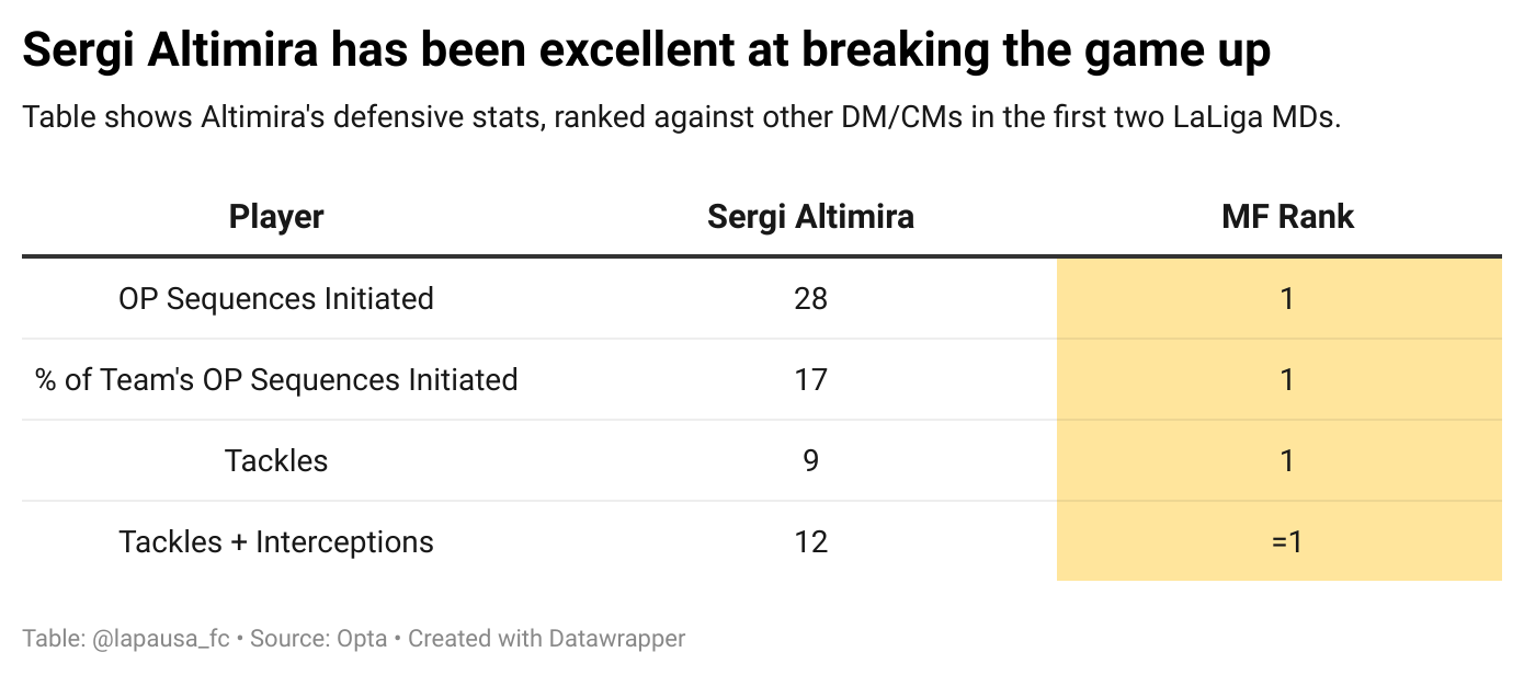 Like Cardoso, the 23-year-old is an excellent recuperador. Reading the development of play to be able to intercept, being rangey enough to cover ground and pick up loose balls, and with an improving physicality at the top level, Altimira looks primed to become one of the better midfielders in LaLiga on that front.