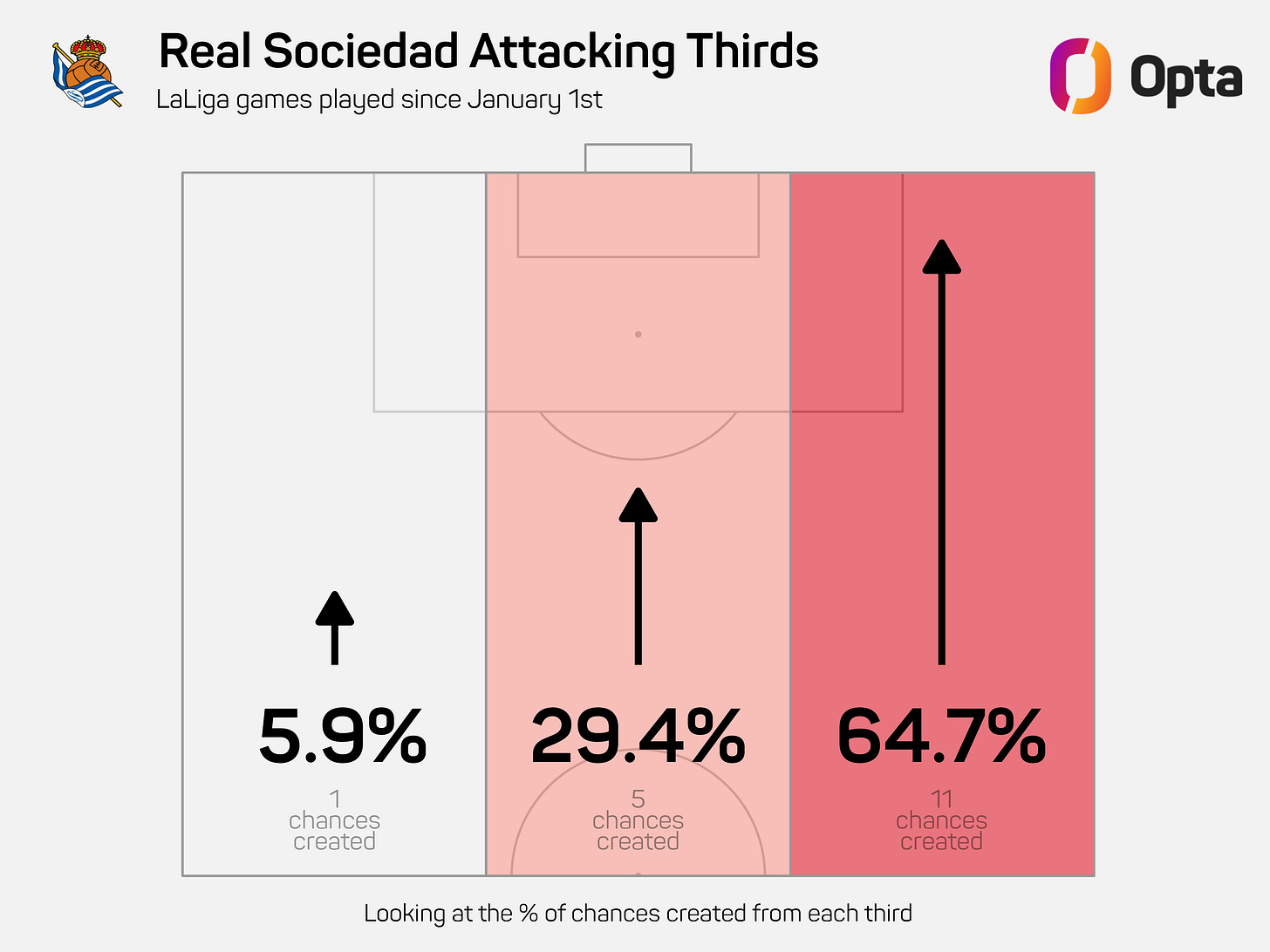 It's there on the attacking side that we’re seeing the worst of them. Real Sociedad still defend well structurally most of the time, they still work incredibly hard, and they can still spook opponents with their team-wide pressing efforts. With the ball, though, there’s a pervading sense of safety and predictability. They’re one of only six sides who haven’t scored a goal following a 10-pass sequence this term, despite having had 217 of them in total. Indeed, without Take Kubo’s individual incision, they have constantly ran into walls when trying to shift the opponent around and open up space through movement of the ball.