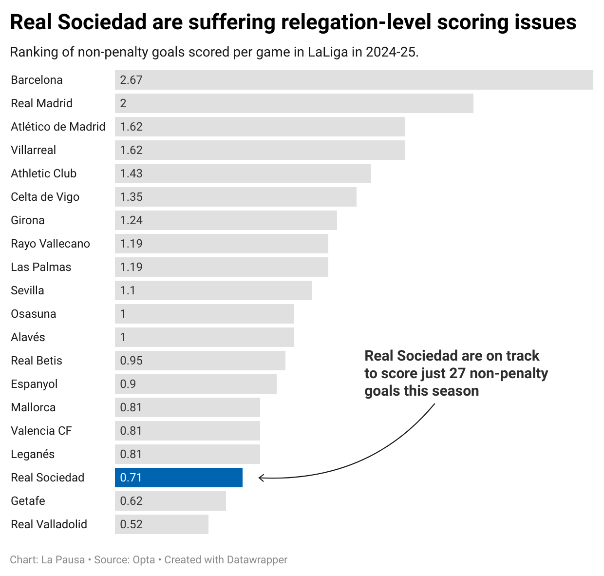 Real Sociedad have never been a high-scoring team under Imanol Alguacil. Not even when they had Alexander Isak in their ranks, nor when they had David Silva still playing at an elite level late in his 30s (thought it was easier then). The highest-scoring team of the Alguacil era, back in 2019-20, saw them net 52 non-penalty goals in LaLiga. Seven different teams have all bettered that in seasons since.