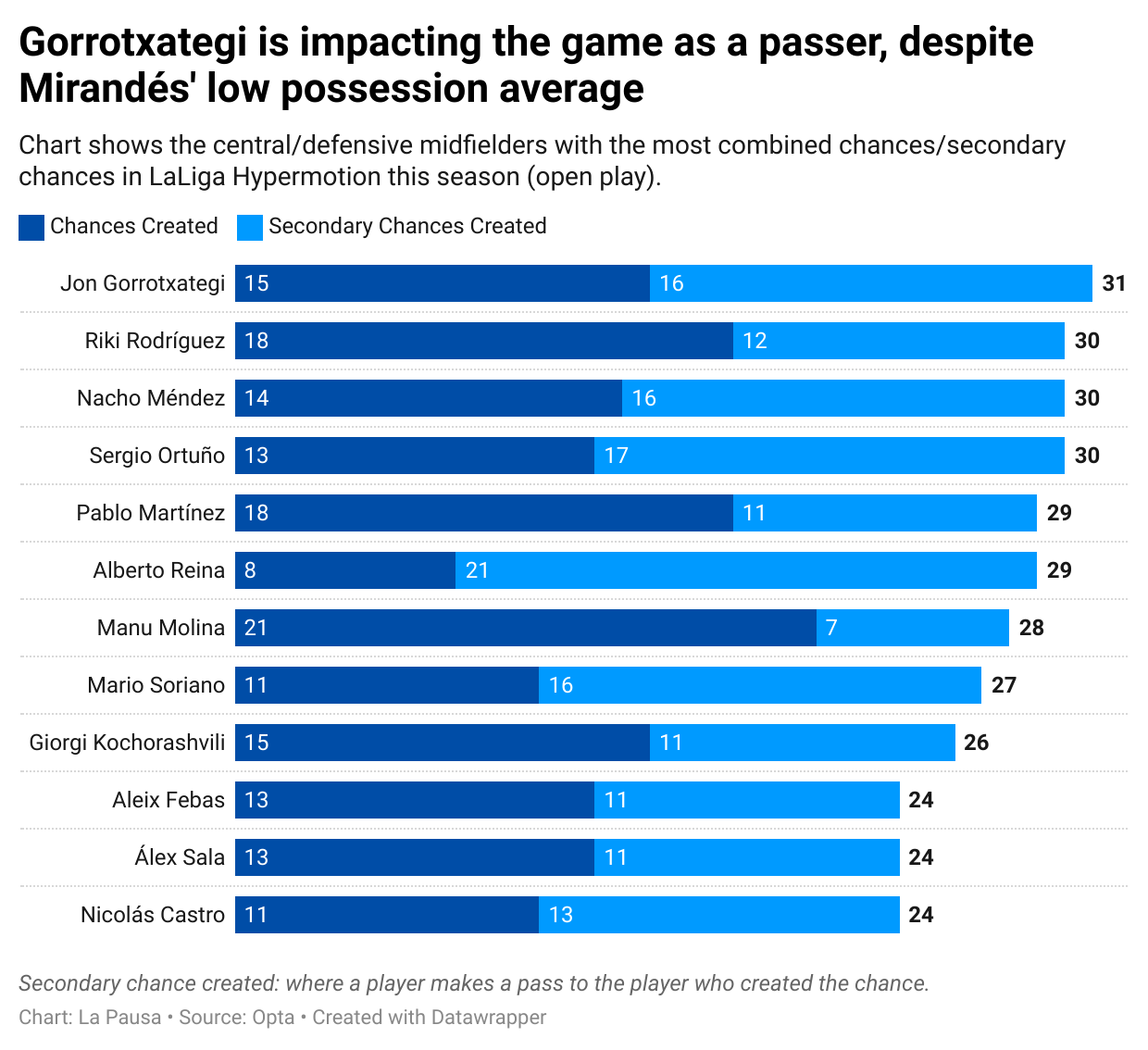 Particularly in the context of how his play translates to a higher level, his quality of pass when directing the game from within the opposition half bodes well. Among all central and defensive midfielders in LaLiga Hypermotion this season, Gorrotxategi sits top of the list for chances created in open play, when combined with ‘secondary’ chances that register the pass for a player who does so with the next action.
