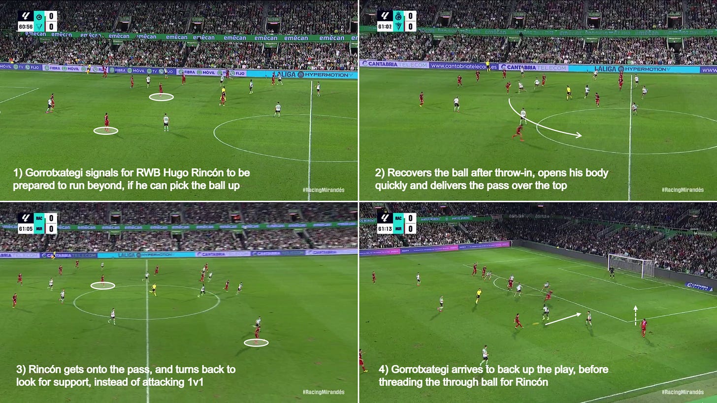 In the clip below, note how he denies Racing’s counter-pressing opportunity by holding onto the ball. When a pass back to Raúl Fernández – the likeliest option – would have ended in the goalkeeper having to clear it long, Gorrotxategi feints back out of Racing’s pressure and sorts his feet out quickly to find Julio Alonso.