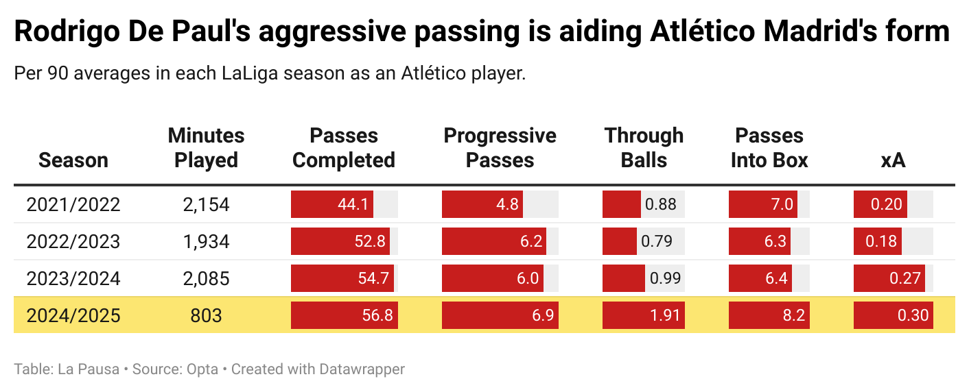 In the first half of the 2024-25 campaign, the sense is that they might now be closer to solving that than ever. Indeed, rather than pull back, and rather than dimming down his intent in place of heightened efficiency, we are seeing De Paul being more aggressive than ever with his distribution — all of which has been to Atlético’s gain.