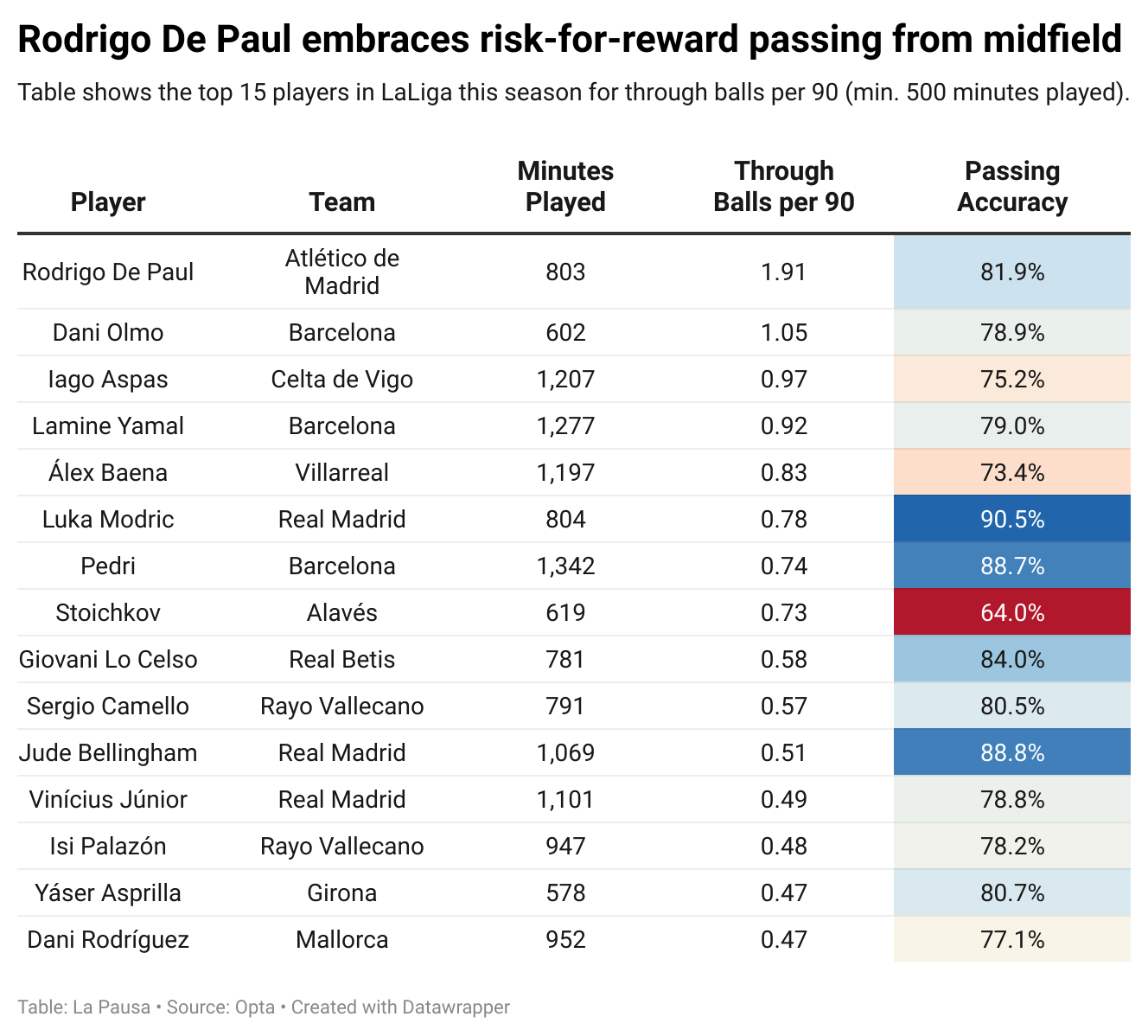 In that increasingly stable environment, it has only served to encourage De Paul’s already-expansive passing game. He is averaging just under two through balls per 90, which is almost twice as many as the player with the next most in LaLiga this season, in the form of Dani Olmo. Indeed, De Paul’s average is the highest of anyone across Europe’s big five leagues this term too.