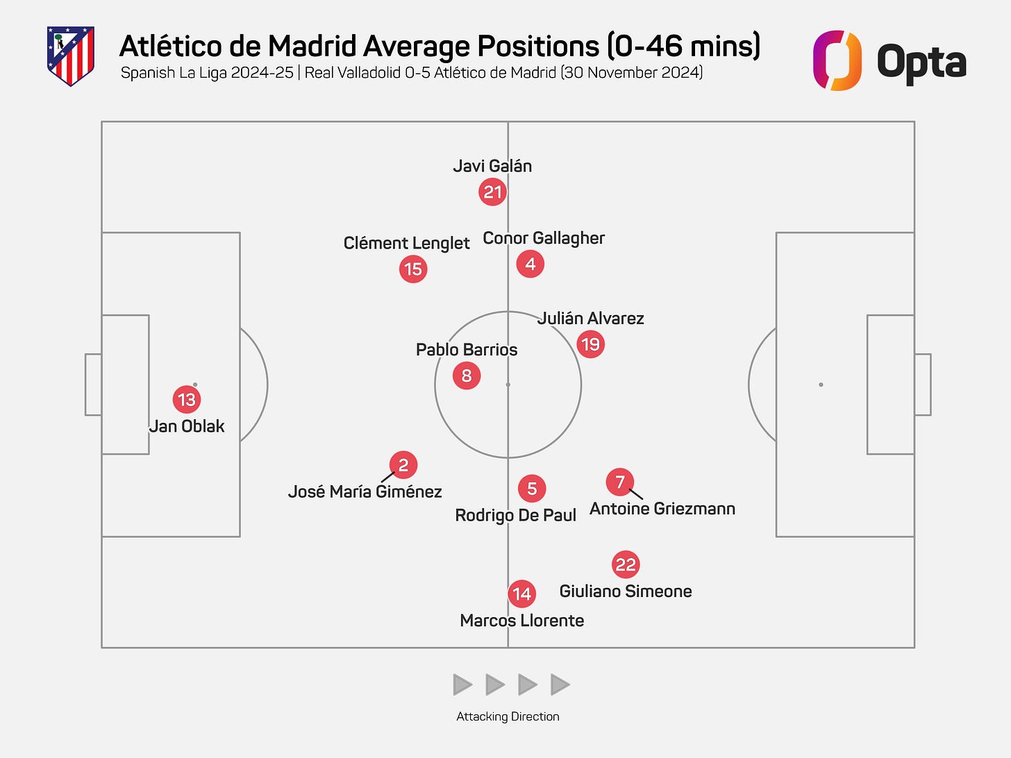Particularly since Atlético’s return to the 4-4-2 system, the distribution of players on the pitch — as well as the profile of said players — has enhanced the conditions for De Paul’s punchy passing game. The crucial aspect that underlies everything, however, is the fact this version of Simeone’s side are incredibly active in attack. Their movement ahead of the ball is generous, and the players who are doing so are athletic to boot. Julián Álvarez runs hard and smart, Antoine Griezmann recurs in the same way, Javi Galán and Marcos Llorente fly from full back, Giuliano Simeone is a relentless runner, and the mobility between Alexander Sørloth and Ángel Correa off the bench has been a solution all season long.