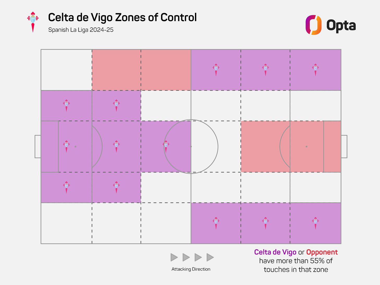 Where Mingueza brings the craft, Giráldez has built the context for it to arrive. Celta’s 5-4-1 shape out of possession and the fact they use a right-sided centre back who can slide round to become a situational right back, means Mingueza is well covered. If he vacates the flank and goes wandering inside, the team aren’t immediately going to be exposed on the right side. And with at least the back three (almost) always behind the ball, there’s a platform to sustain his movements in the opposition half.