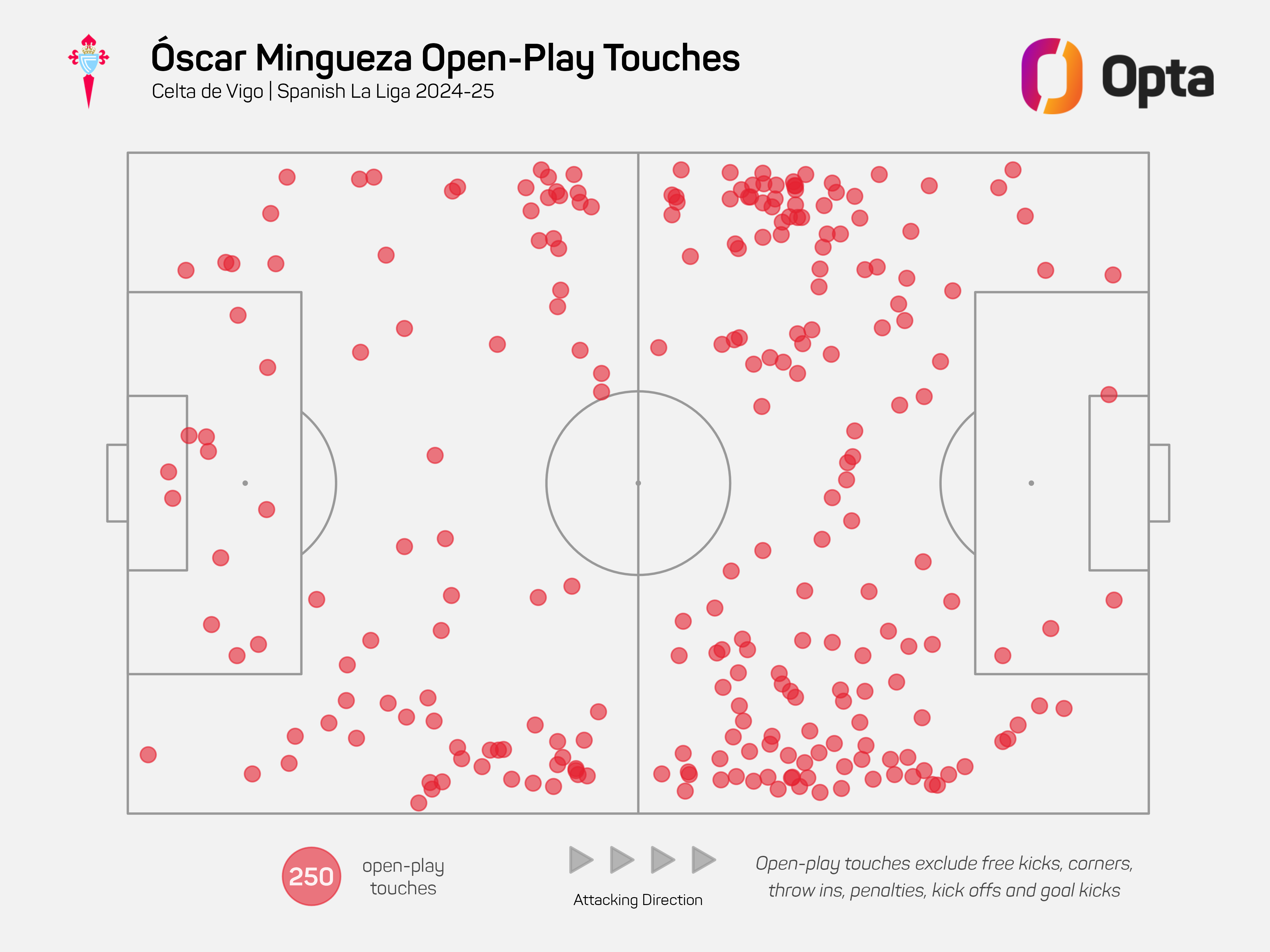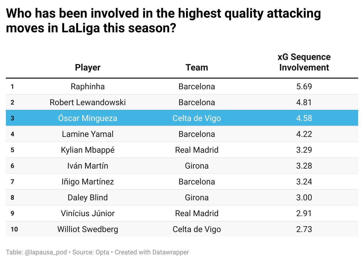 “There are few players that bring the ball out like him, that have the capacity to break lines with passes and by carrying the ball,” Giráldez said earlier this year. And as he and Celta have since been able to clarify, that imagination extends all across the pitch.