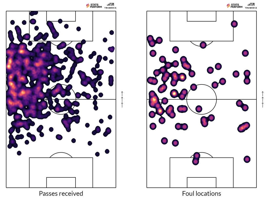 The Atlético man’s reduced involvement, compared to other stars of the game, isn’t just anecdotal though. Félix’s reduced involvement in play is, paradoxically, a factor tied to his amount of stoppages. Quite simply, a player who only receives 30 passes in a game is less likely to put the opposition under pressure in respect to fouls and cards as the same player when he has twice as many opportunities to provoke those situations. The more persistent a threat, the less willing opponents are to seek interruptions.
